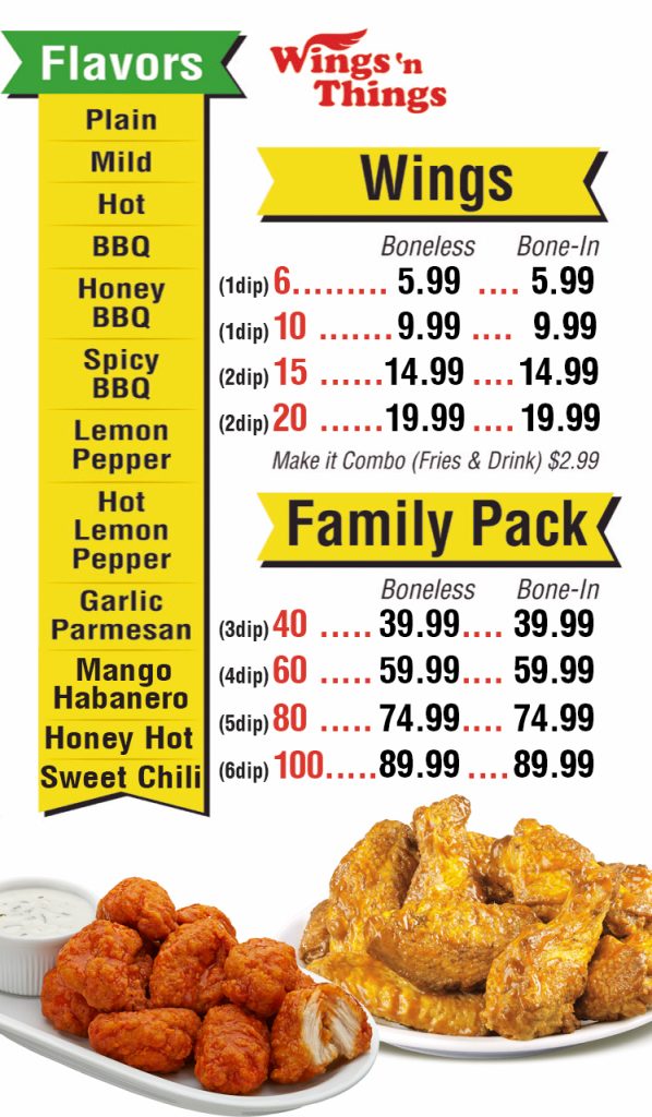 Call us : 225-442-1244 Place your Order Online and Pickup your food at Wings N Things Order Here Menu They All Love Our Food "Most amazing I ever had!!" - Bryan G "Amazing taste, and wings!! Best ever!!" - Lauran Kaynuk "I always visit here, and they always surprise me." - Harold Z "A must visit for every wings lover" - Jasmine Patricia
